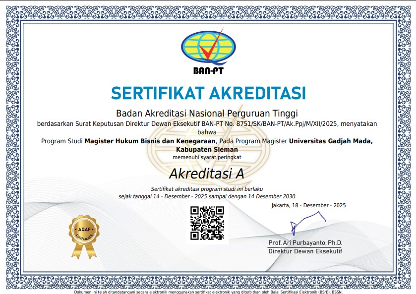 Berdasarkan Keputusan BAN-PT No. 8751/SK/BAN-PT/Ak.Ppj/M/XII/2025, menyatakan bahwa Program Studi Magister Hukum Bisnis dan Kenegaraan, Pada Program Magister Universitas Gadjah Mada, terakreditasi dengan peringkat “A” berlaku sejak tanggal 14 Desember 2025 sd. 14 Desember 2030.