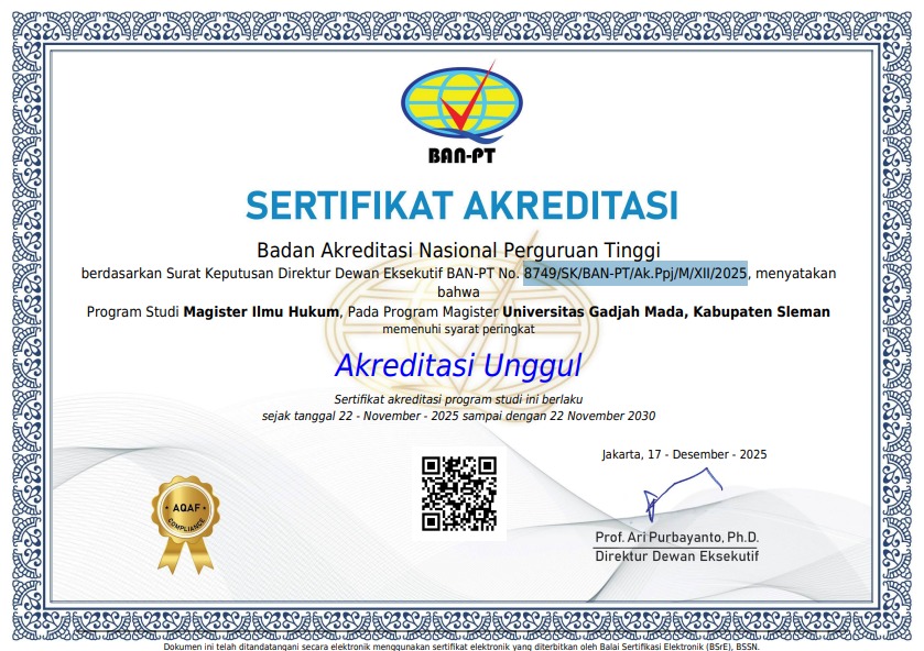 Berdasarkan keputusan BAN-PT No. 8749/SK/BAN-PT/Ak.Ppj/M/XII/2025, menyatakan bahwa Program Studi Magister Ilmu Hukum, Pada Program Magister Universitas Gadjah Mada, terakreditasi dengan peringkat “Akreditasi Unggul” berlaku sejak tanggal 22 November 2025 sd. 22 November 2030.