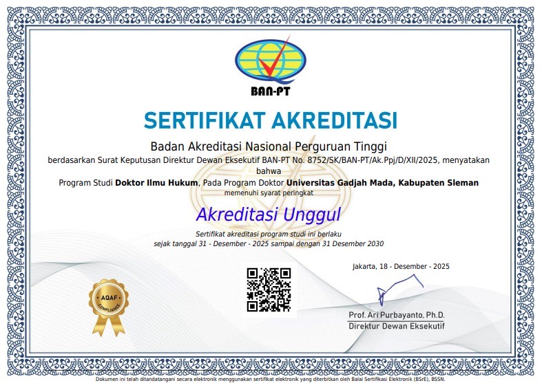 Berdasarkan Keputusan Direktur Dewan Eksekutif BAN-PT No. 8752/SK/BAN-PT/Ak.Ppj/D/XII/2025, menyatakan bahwa Program Studi Ilmu Hukum, Pada Program Doktor Universitas Gadjah Mada, Kabupaten Sleman memenuhi syarat peringkat “Akreditasi Unggul”. Sertifikat berlaku sejak tanggal 31 Desember 2025 sd. 31 Desember 2030.