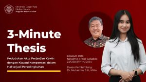 Student Activity Three Minute Thesis #1 Program Studi Magister Kenotariatan Fakultas Hukum UGM “Kedudukan Akta Perjanjian Kawin dengan Klausul Kompensasi dalam Hal terjadi Perselingkuhan” May 10, 2025