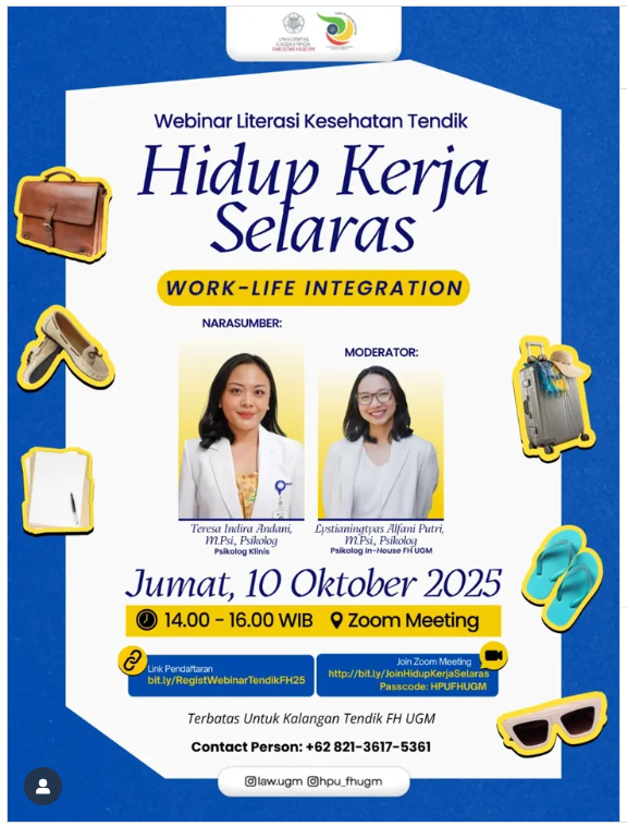 Fakultas Hukum Universitas Gadjah Mada (FH UGM) melaui unit Health Promoting University (HPU) menggelar webinar literasi kesehatan bertajuk “Hidup Kerja Selaras: Work-Life Integration” pada Jumat (10/10/2025). Kegiatan ini ditujukan untuk tenaga kependidikan (tendik) sebagai upaya peningkatan kesadaran akan pentingnya keseimbangan antara pekerjaan dan kehidupan pribadi dalam menjaga kesehatan mental.