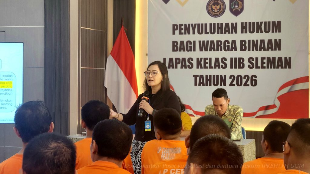 On Friday, February 20, 2026, the Faculty of Law, Universitas Gadjah Mada (FH UGM), through its Legal Consultation and Aid Center (PKBH), successfully conducted its inaugural legal counseling program for 2026 at the Class IIB Sleman Correctional Facility (Lapas). This legal counseling initiative serves as a concrete step taken by PKBH FH UGM to implement community service, thereby fulfilling the Tri Dharma Perguruan Tinggi (Three Pillars of Higher Education). This multi-helix activity involved various elements of the academic community, ranging from lecturers to university students.