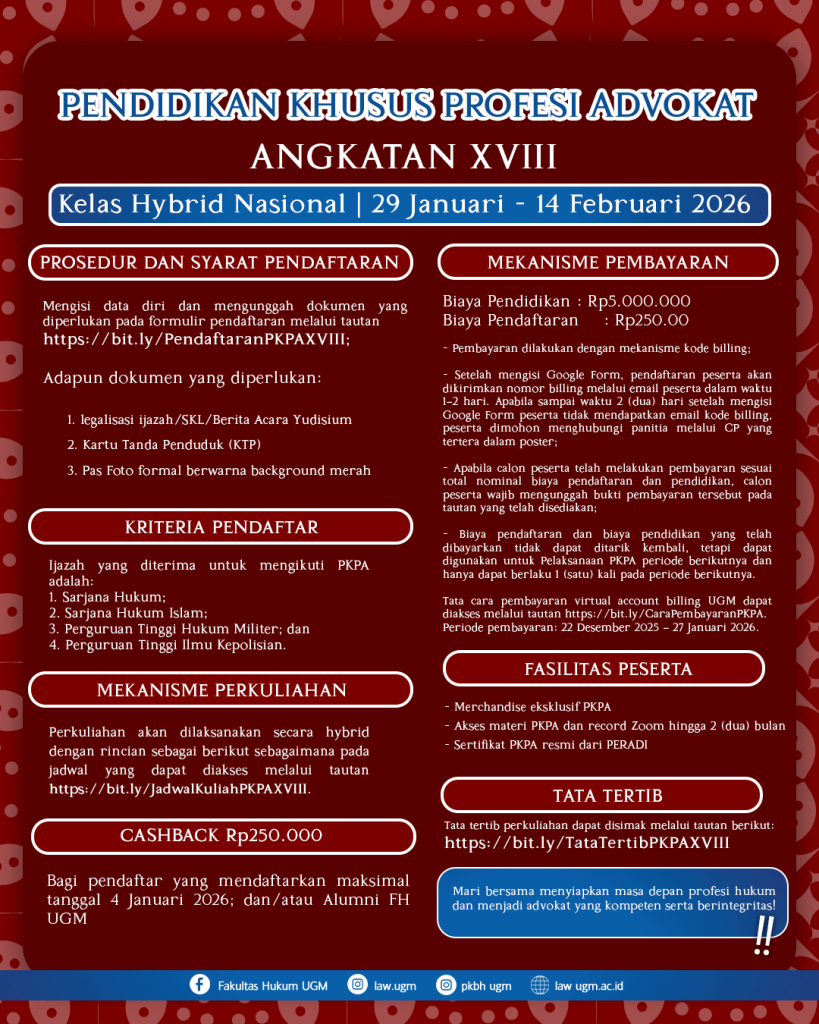 Fakultas Hukum Universitas Gadjah Mada bekerja sama dengan Perhimpunan Advokat Indonesia (PERADI) menyelenggarakan Pendidikan Khusus Profesi Advokat (PKPA) Angkatan XVIII Tahun 2026. Program ini ditujukan bagi calon advokat untuk memperdalam pengetahuan hukum, memperkuat integritas profesi, serta mengembangkan keterampilan praktis sebagai persiapan menghadapi Ujian Profesi Advokat (UPA). Dengan dukungan pengajar berpengalaman dan kurikulum yang disusun sesuai standar profesi, PKPA ini mempersiapkan Anda memasuki dunia praktik hukum dengan kepercayaan diri dan kompetensi yang matang. Jangan lewatkan kesempatan ini dan segera daftarkan diri Anda untuk menjadi advokat unggul!
