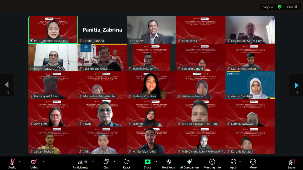 Perkuliahan Pendidikan Khusus Profesi Advokat (PKPA) Angkatan XVI tahun 2025 resmi ditutup pada Sabtu (30/08/2025) yang diselenggarakan secara daring (online). Penutupan ini menandakan bahwa PKPA Angkatan XVI yang menjadi kolaborasi antara FH UGM dengan Perhimpunan Advokat Indonesia Suara Advokat Indonesia (PERADI SAI) telah usai.